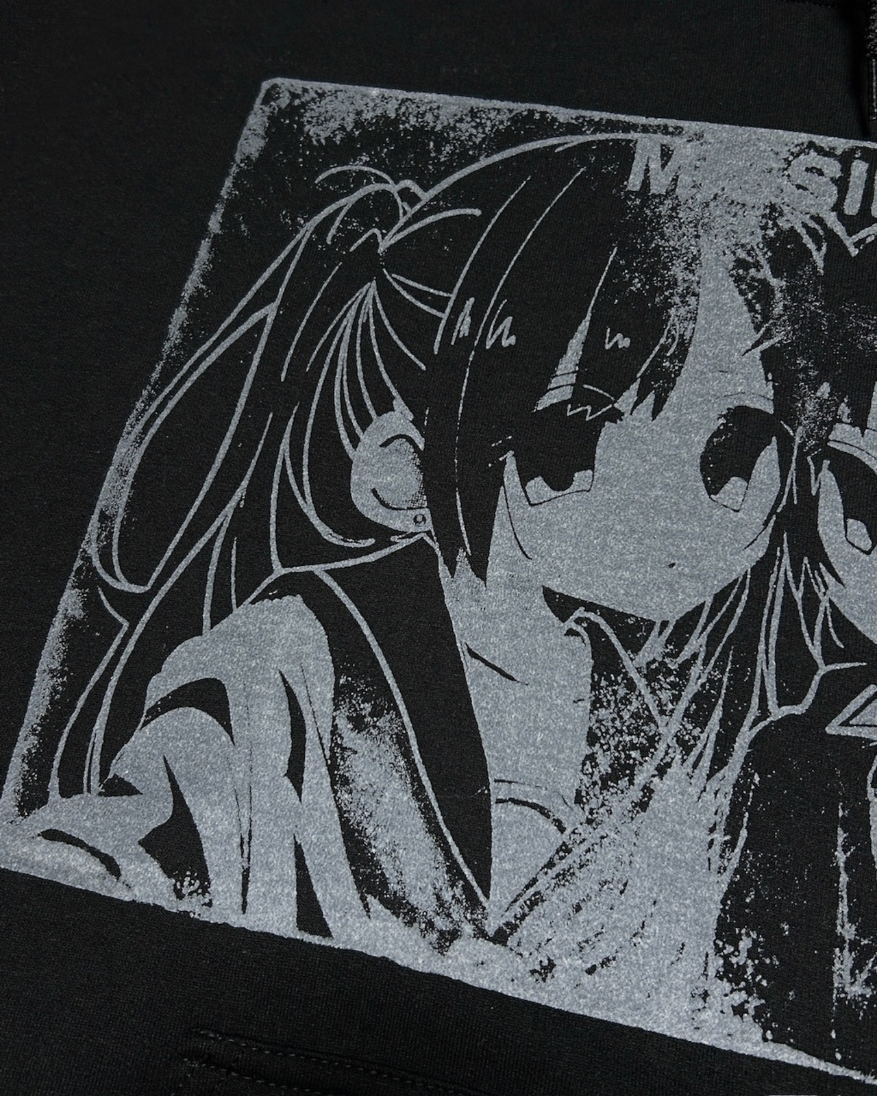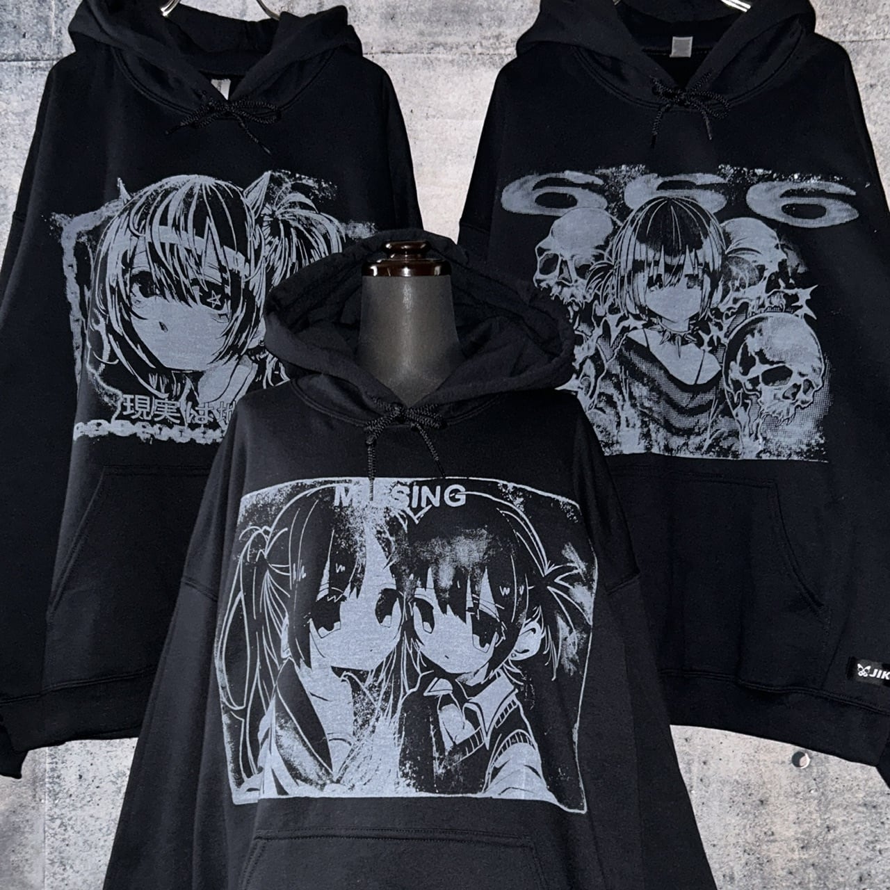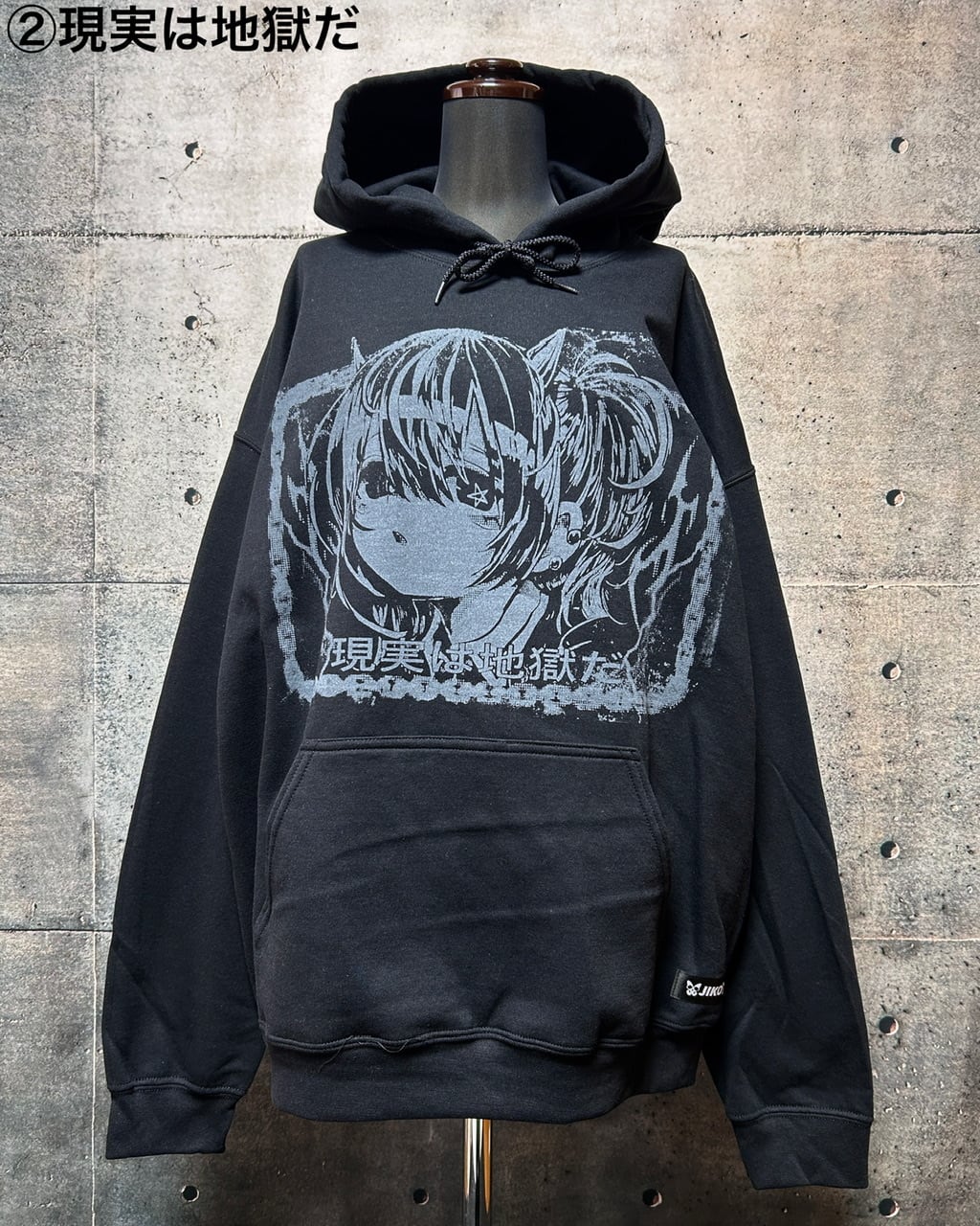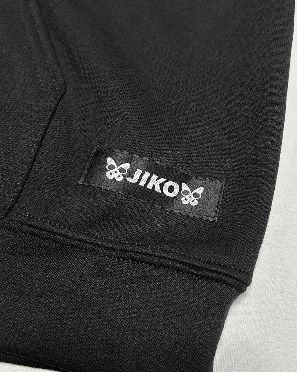 XLサイズの黒パーカーにJIKOオリジナルイラストをハンドプリント。